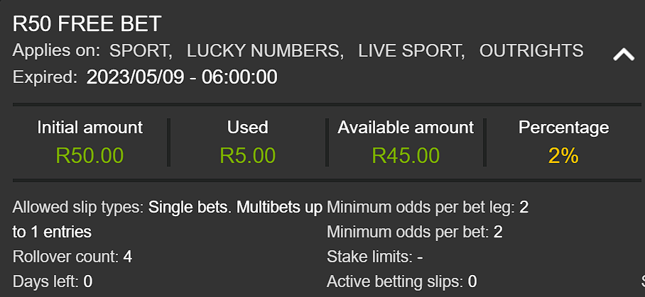 You can view information about any bonus by navigating to your Bonus Offers and clicking on the specific bonus you want to use. This will provide details such as days remaining, minimum odds per bet, and your rollover percentage.